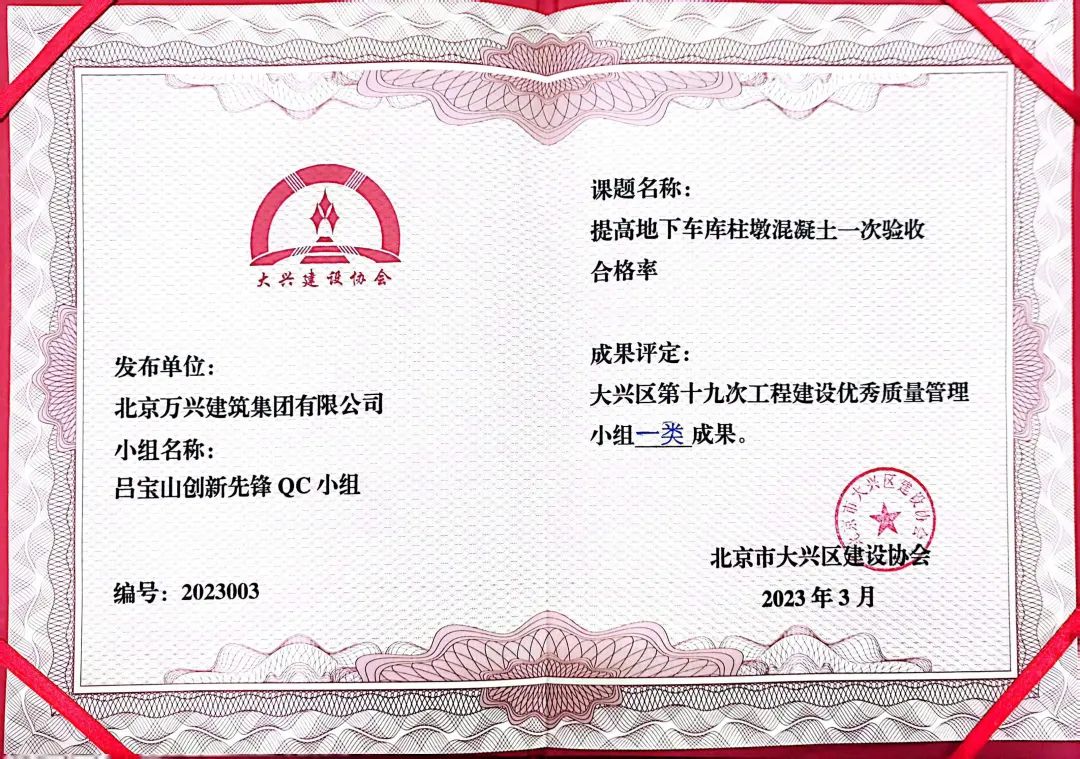 集團十五分公司呂寶山創(chuàng)新先鋒小組成果:《提高地下車庫柱墩混凝土一次驗收合格率》榮獲一類成果