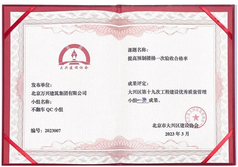 集團十三分公司不翻車QC小組成果:《提高預制樓梯一次驗收合格率》榮獲一類成果