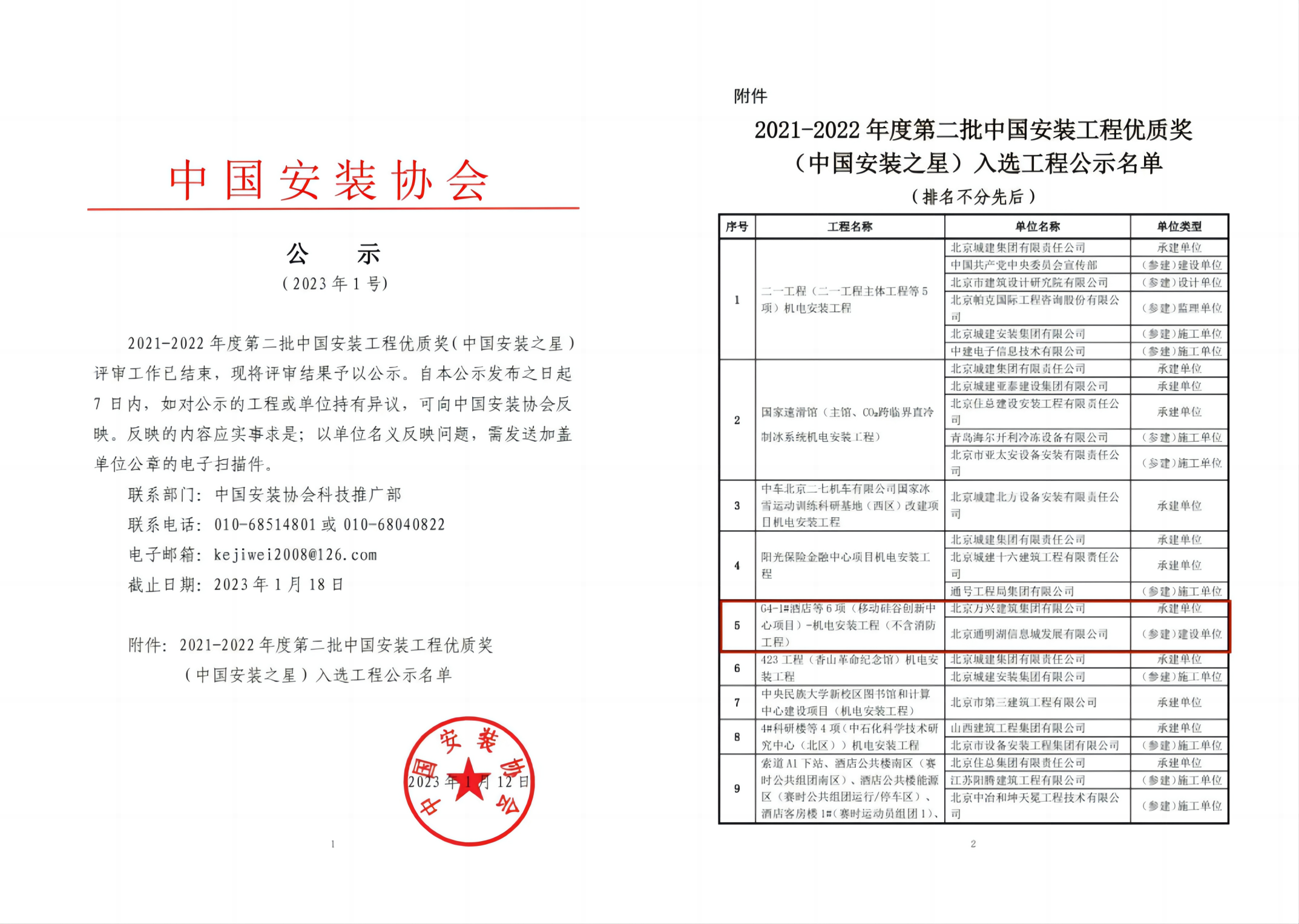 【概要描述】近日,中國(guó)安裝協(xié)會(huì)公布了2021~2022年度第二批中國(guó)安裝工程優(yōu)質(zhì)獎(jiǎng)(中國(guó)安裝之星)入選名單,由北京萬興集團(tuán)十五分公司承建的G4-1#酒店等6項(xiàng)(移動(dòng)硅谷創(chuàng)新中心項(xiàng)目)成功摘“星”,為萬興集團(tuán)再添1項(xiàng)國(guó)家級(jí)獎(jiǎng)項(xiàng)。