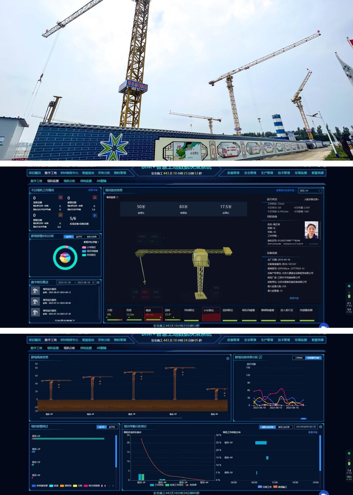 項(xiàng)目裝備塔吊的塔基監(jiān)測系統(tǒng),對(duì)五限位、群塔防碰撞及時(shí)預(yù)警,引入吊鉤可視化設(shè)備,極大提高了塔吊作業(yè)安全和工作效率。