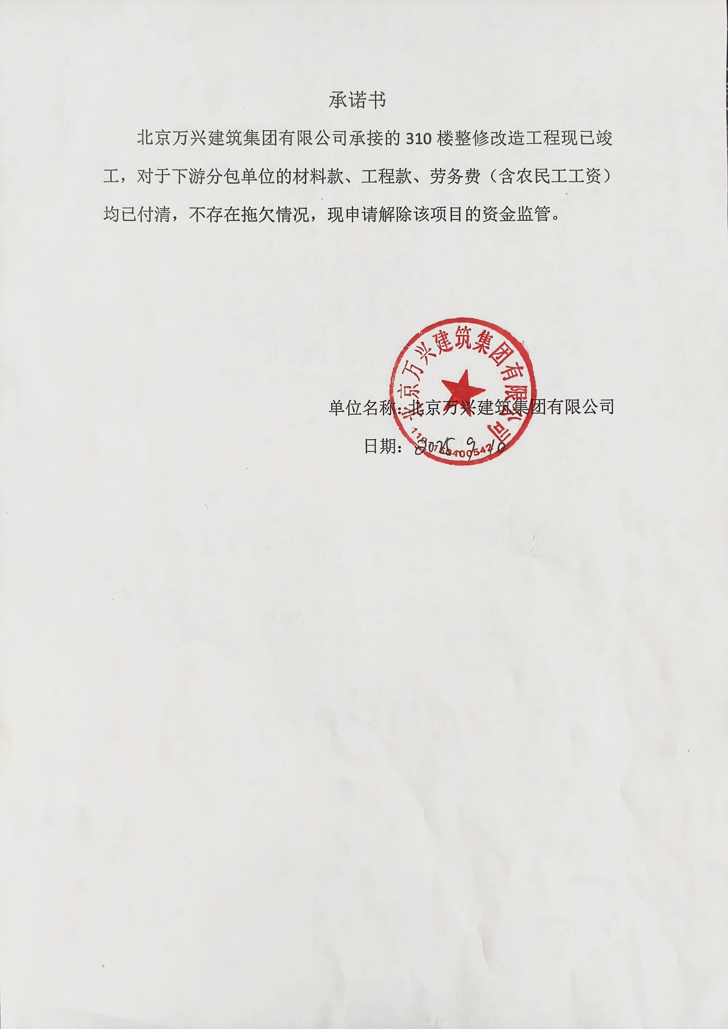 2025年9月10日,北京萬興建筑集團有限公司針對承接的310樓整修改造工程申請解除資金監(jiān)管做出承諾,現將《承諾書》(附件1)在本網站進行公示。